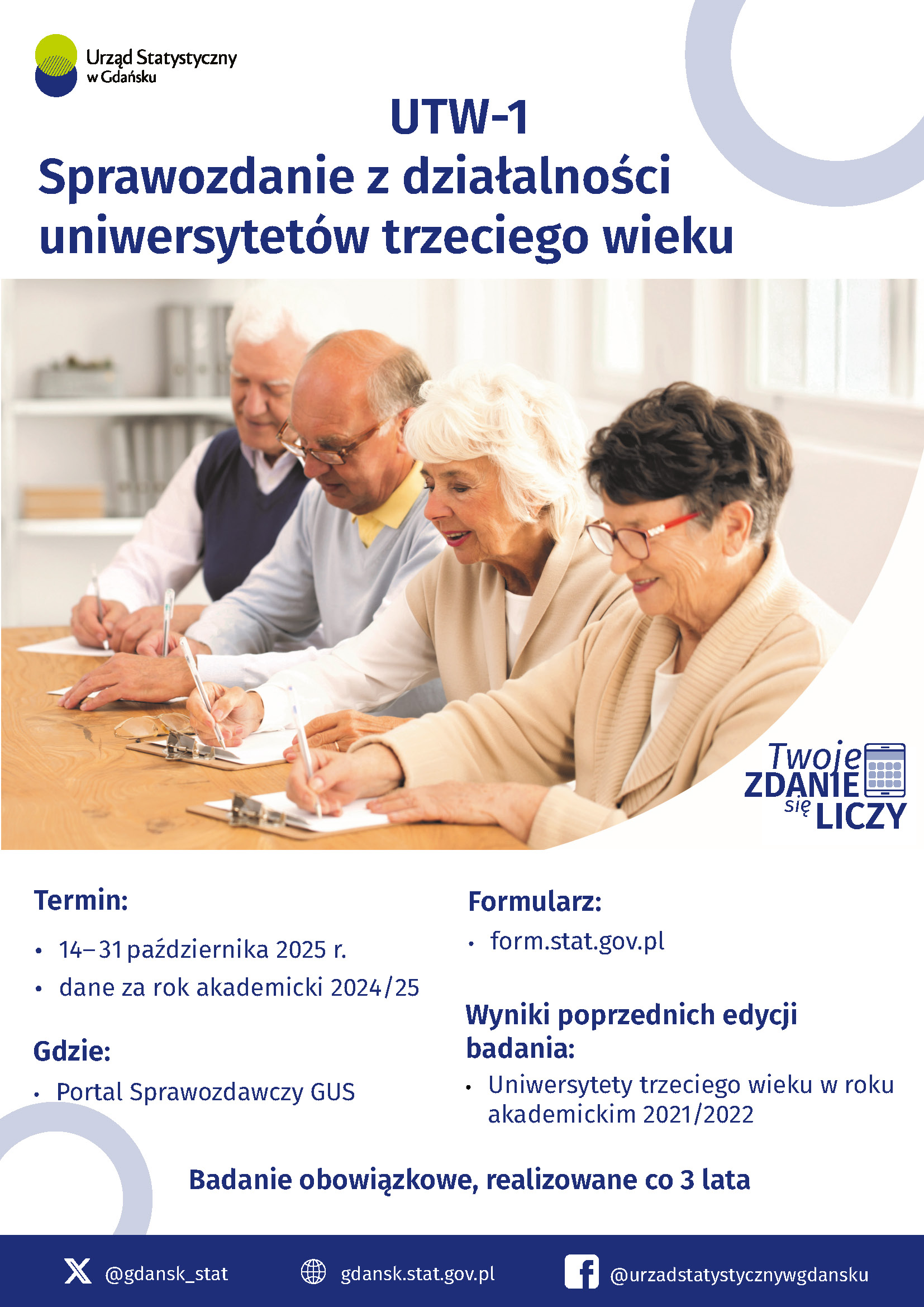 Uprzejmie informujemy, że w dniach od 14 do 31 października 2025 r. Urząd Statystyczny w Gdańsku realizuje badanie UTW-1 Sprawozdanie z działalności uniwersytetów trzeciego wieku. Zostało ono wpisane do Programu badań statystycznych statystyki publicznej na rok 2025 (1.27.13).
