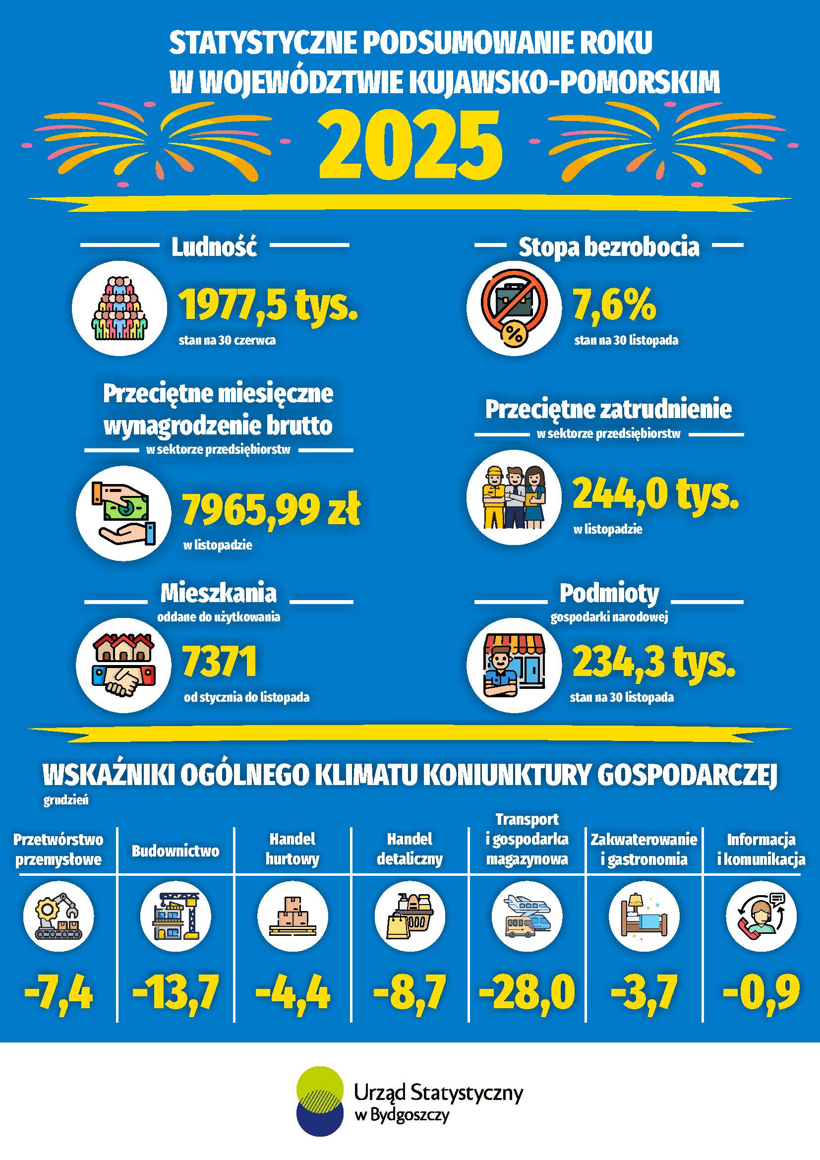 Statystyczne podsumowanie roku w województwie kujawsko-pomorskim 2025 (Infografika) A A A 31.12.2025 Pliki do pobrania Statystyczne podsumowanie roku w województwie kujawsko-pomorskim 2025 (Infografika) 1.94 MB Statystyczne podsumowanie roku w województwie kujawsko-pomorskim 2025 (Infografika) 0.39 MB Statystyczne podsumowanie roku w województwie kujawsko-pomorskim 2025 (Infografika) 0.02 MB