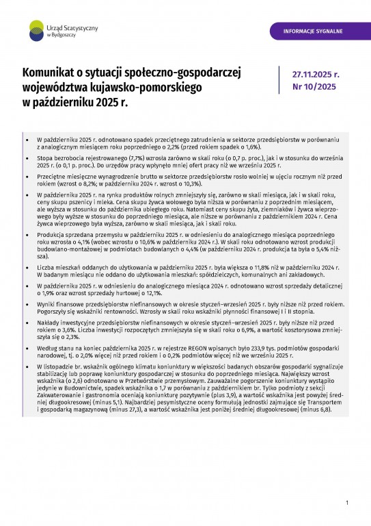 Komunikat o sytuacji społeczno-gospodarczej województwa kujawsko-pomorskiego - październik 2025 r.