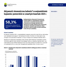 Opracowanie sygnalne zawiera informacje pozyskane na podstawie Badania Aktywności Ekonomicznej Ludności, którego przedmiotem jest fakt wykonywania, posiadania lub poszukiwania pracy przez osoby w wieku 15-89 lat. Prezentuje dane dotyczące osób aktywnych i biernych zawodowo oraz pracujących i bezrobotnych według płci, wieku, miejsca zamieszkania i poziomu wykształcenia w województwie kujawsko-pomorskim w czwartym kwartale 2025 r.