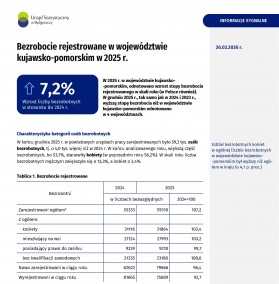 Informacja sygnalna prezentuje zakres danych statystycznych dotyczących osób bezrobotnych zarejestrowanych w powiatowych urzędach pracy. W oparciu o dane zgromadzone w sprawozdaniach Ministerstwa Rodziny i Polityki Społecznej (MRPiT-01 i MRPiT-02), przedstawiono liczbę osób bezrobotnych (według wybranych kryteriów), stopę bezrobocia oraz liczbę ofert pracy, które wpłynęły do urzędów pracy. Dokonano także porównań województwa kujawsko-pomorskiego na tle pozostałych województw w Polsce. Wybrane dane statystyczne zaprezentowane zostały w przekroju na powiaty.
